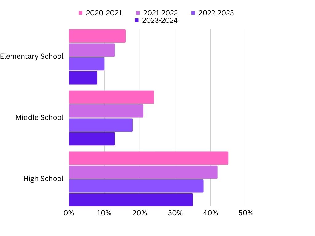The graph above shows that within Prince George’s County Public Schools, 45% of high school students demonstrated proficiency or above in reading during the 2020-2021 Benchmark Assessment, 21% in middle school, and 16% in Elementary School. Furthermore, there is an alarming 3% decreases in scores upon returning to in person learning.